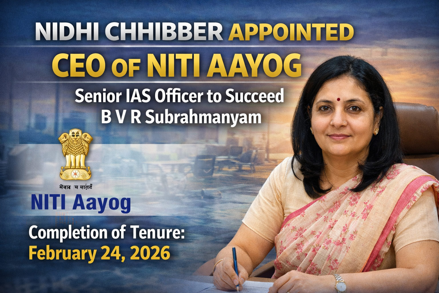 The Central Government has appointed senior IAS officer Nidhi Chhibber as the Chief Executive Officer (CEO) of NITI Aayog following…