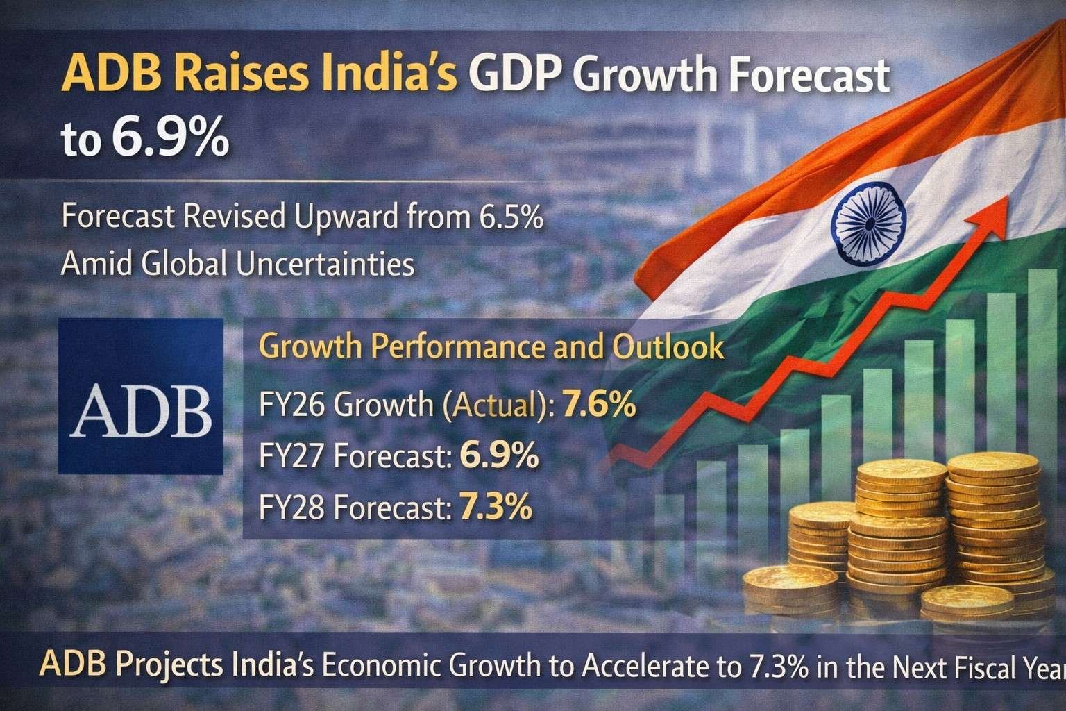 The Asian Development Bank (ADB) has revised India’s GDP growth forecast upward to 6.9% for the current fiscal, from its earlier estimate of 6.5%, highlighting the country’s economic resilience despite global uncertainties.