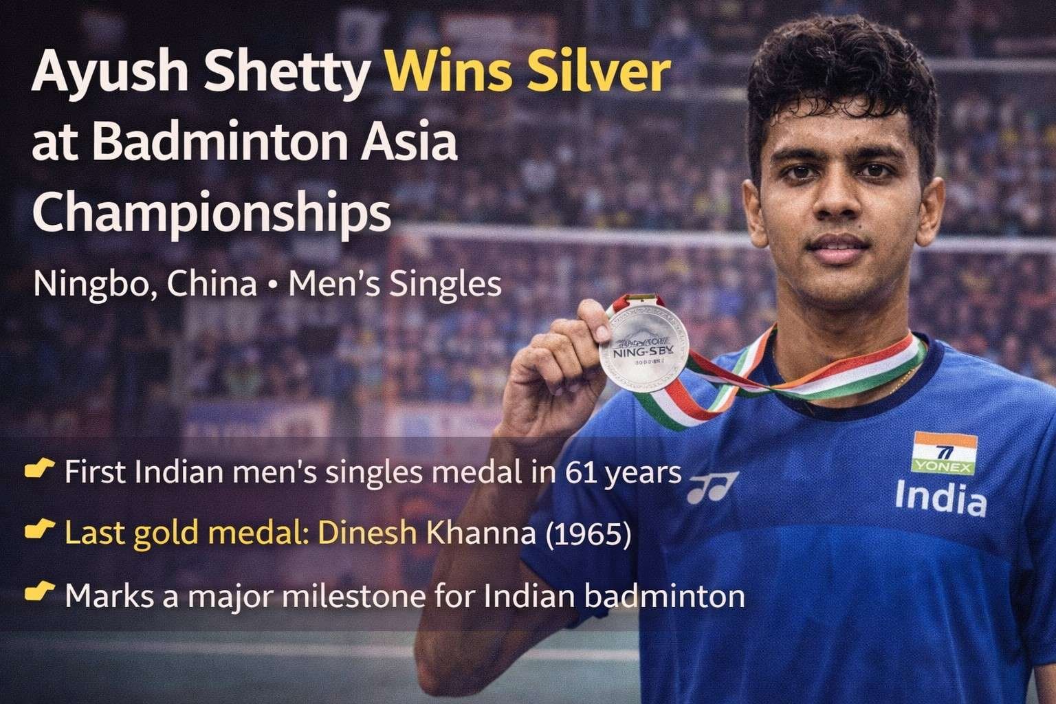 India’s rising badminton star Ayush Shetty created history by winning a silver medal in men’s singles at the Badminton Asia Championships 2026 held in Ningbo, China.