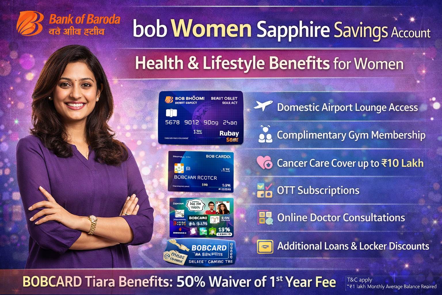 Public sector lender Bank of Baroda (BoB) has introduced a new women-centric savings product called the “bob Women Sapphire Savings Account.” The account is designed to provide a combination of banking, health, and lifestyle benefits for women customers.
