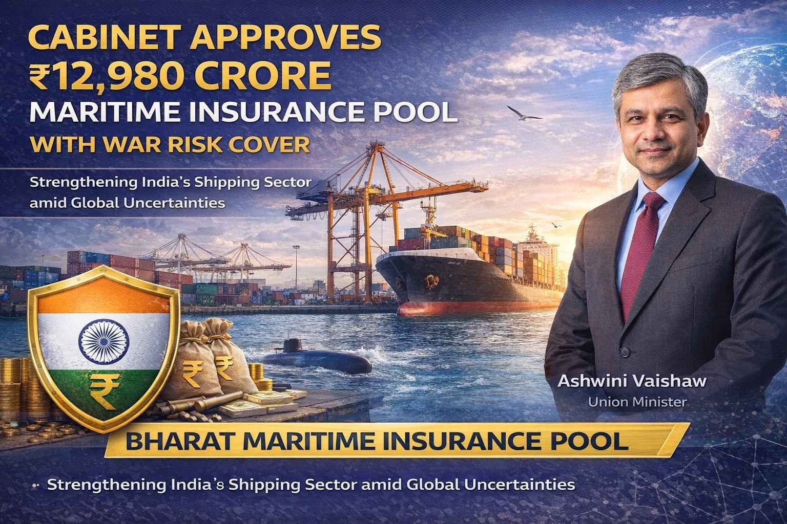In a major step to safeguard India’s maritime trade, the Union Cabinet has approved the creation of a Bharat Maritime Insurance Pool with a sovereign guarantee of ₹12,980 crore.