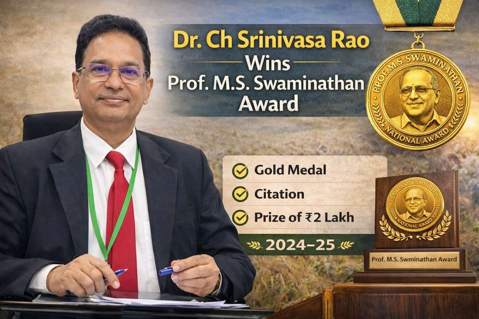 Ch Srinivasa Rao, Director and Vice-Chancellor of the Indian Agricultural Research Institute (ICAR–IARI), has been selected for the prestigious Prof. M.S. Swaminathan Award for 2024–25.