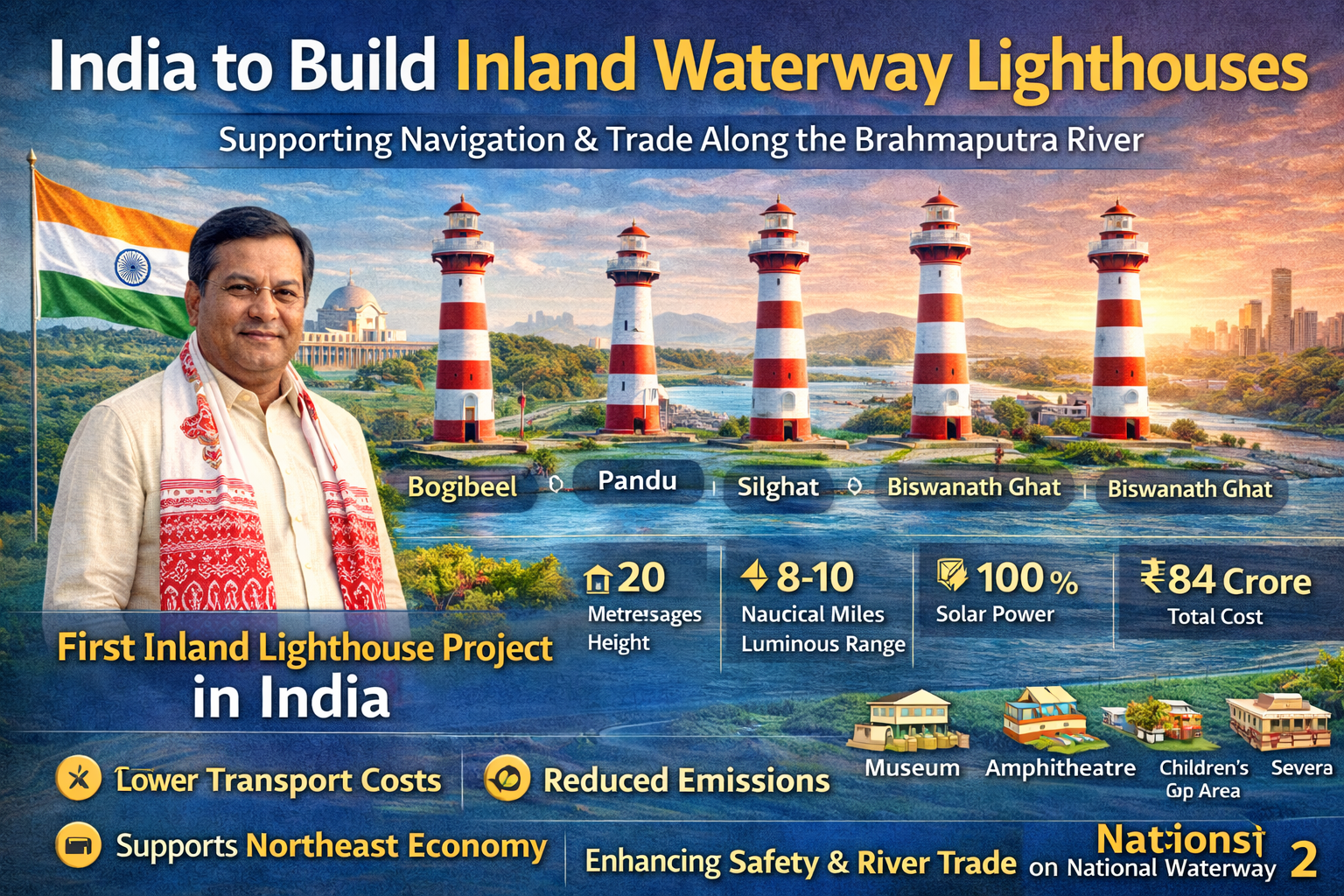 India has taken a major step in improving inland waterway navigation as Union Minister of Ports, Shipping and Waterways Sarbananda Sonowal laid the foundation stone for four river lighthouses along the Brahmaputra River.
