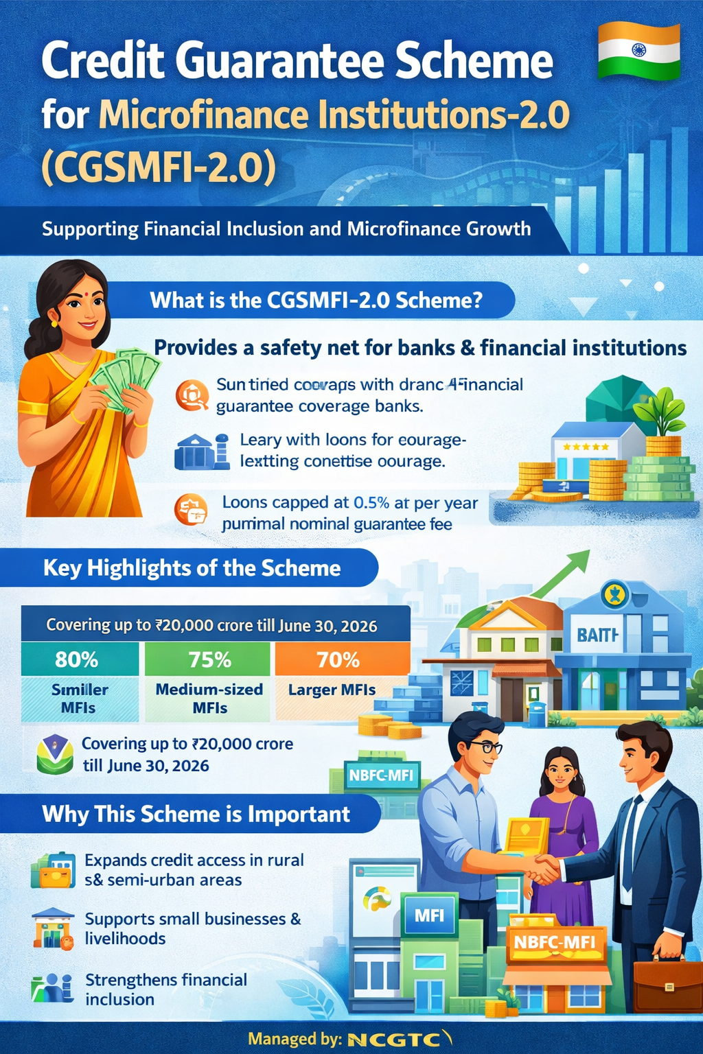 In a significant move to strengthen the microfinance sector and promote financial inclusion, the Government of India has introduced the Credit Guarantee Scheme for Microfinance Institutions-2.0 (CGSMFI-2.0).