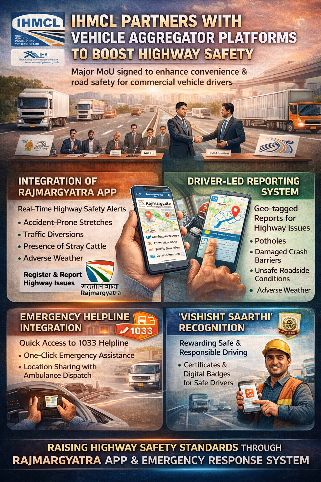In a significant step to enhance the ease of commuting for commercial vehicle drivers and fleet operators, the Indian Highways Management Company Limited (IHMCL) signed a Memorandum of Understanding (MoU) with several commercial vehicle aggregator platforms. IHMCL is a company promoted by the National Highways Authority of India (NHAI).