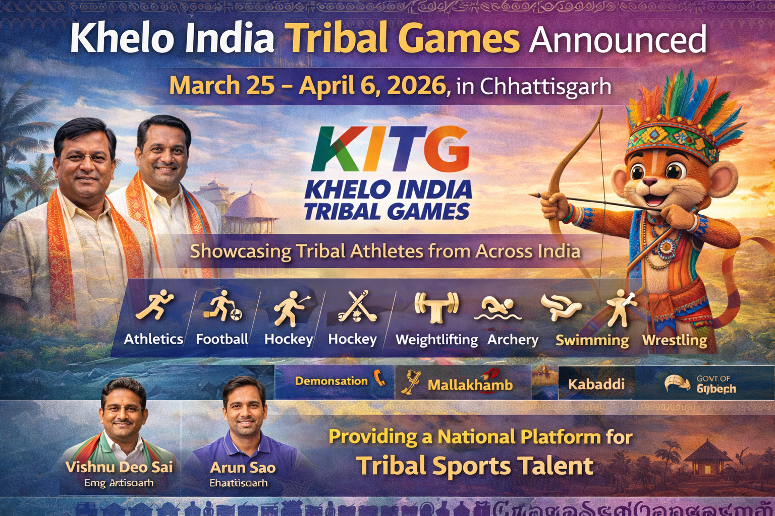 The first edition of the Khelo India Tribal Games (KITG) will be held from March 25 to April 6, 2026, across three cities in Chhattisgarh — Raipur, Jagdalpur, and Sarguja.