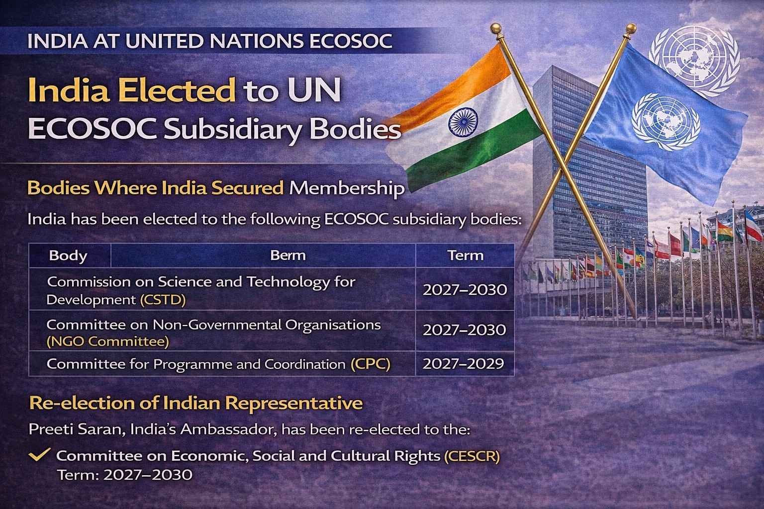 India’s election to multiple ECOSOC subsidiary bodies highlights its growing stature at the United Nations. With active participation in these key committees, India is well-positioned to contribute meaningfully to global development, governance, and policy coordination efforts.