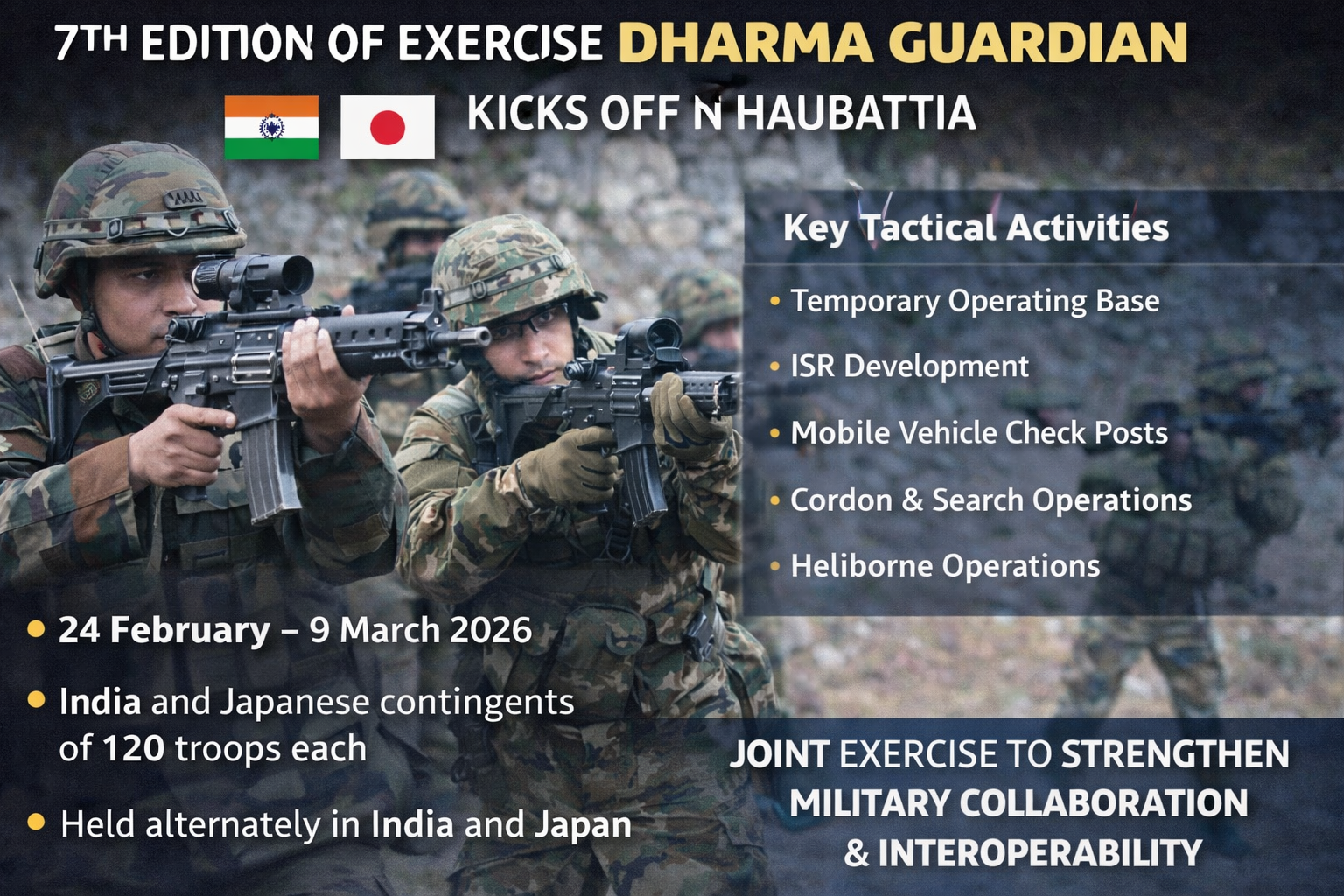 The 7th edition of the annual Joint Military Exercise ‘DHARMA GUARDIAN’ between the Indian Army and the Japan Ground Self-Defense Force (JGSDF) commenced at the Foreign Training Node in Chaubattia, Uttarakhand. The exercise is being conducted from 24 February to 9 March 2026.