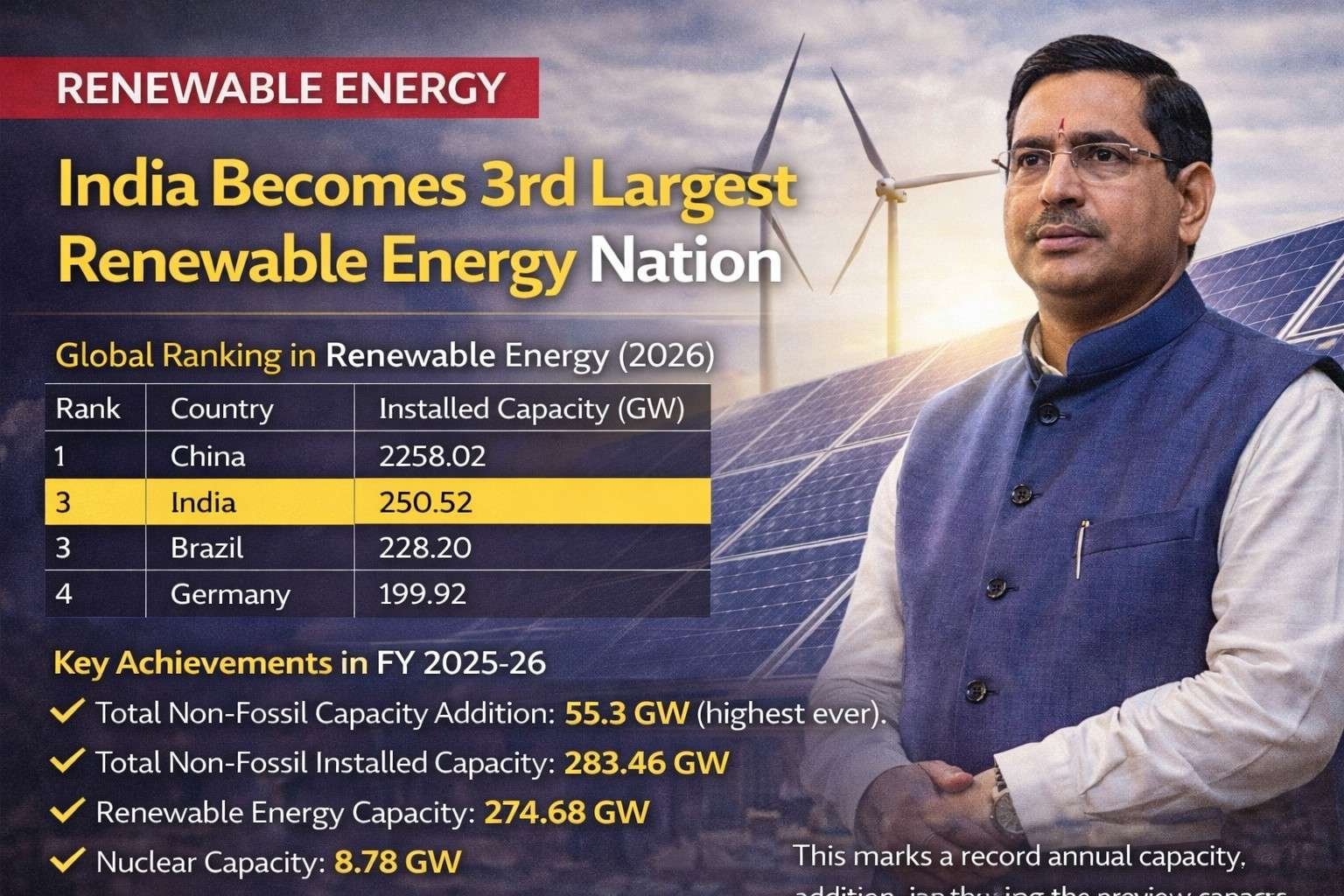 India’s rise to the third position globally in renewable energy capacity reflects its strong commitment to clean energy, climate goals, and sustainable growth. With rapid expansion in solar, wind, and distributed energy, along with supportive policy measures, India is well on track to become a global leader in renewable energy.