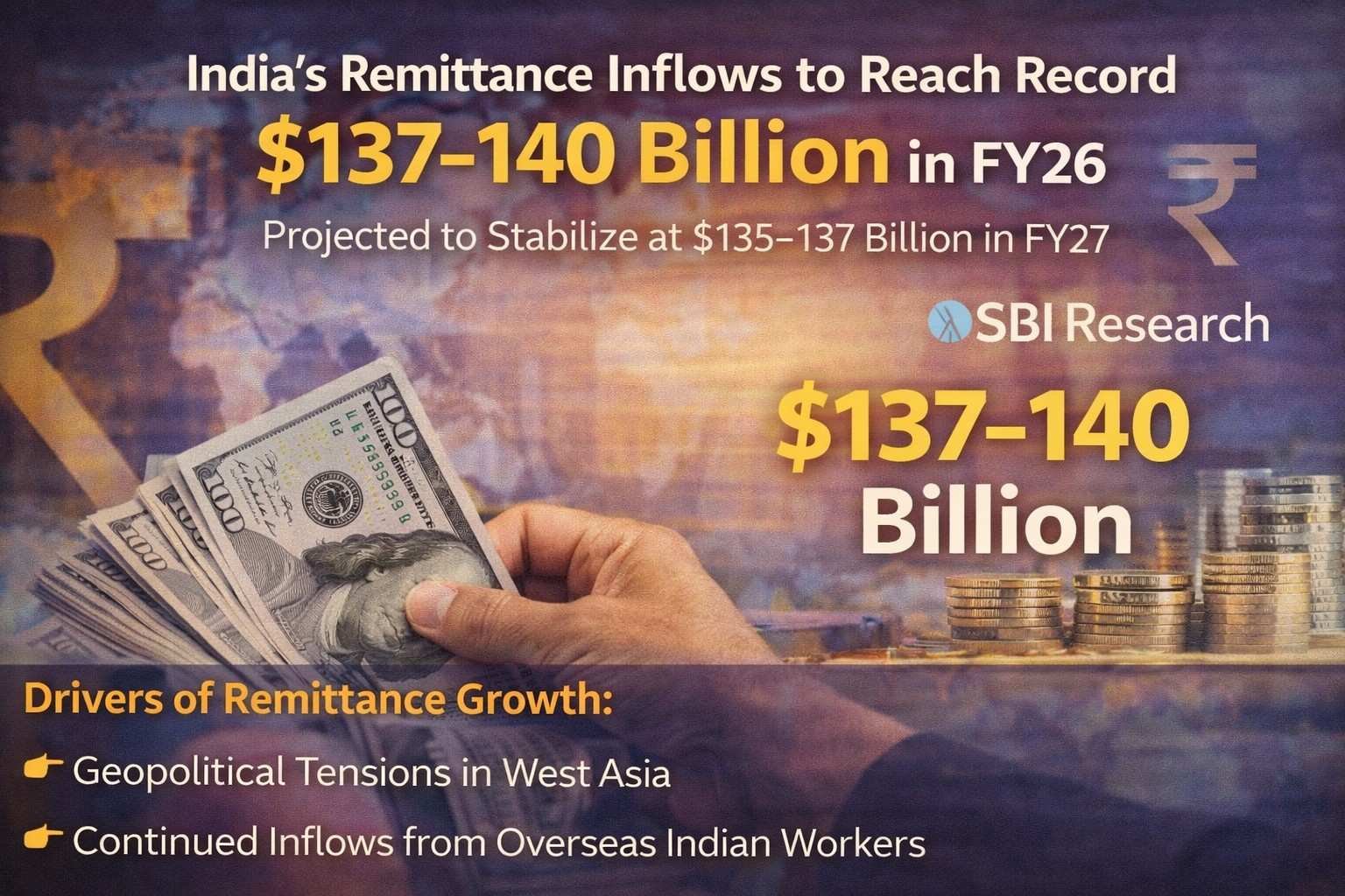 India’s remittance inflows are projected to reach a record $137–140 billion in FY 2025–26 (FY26) before stabilising at $135–137 billion in FY27, according to a report by SBI Research.