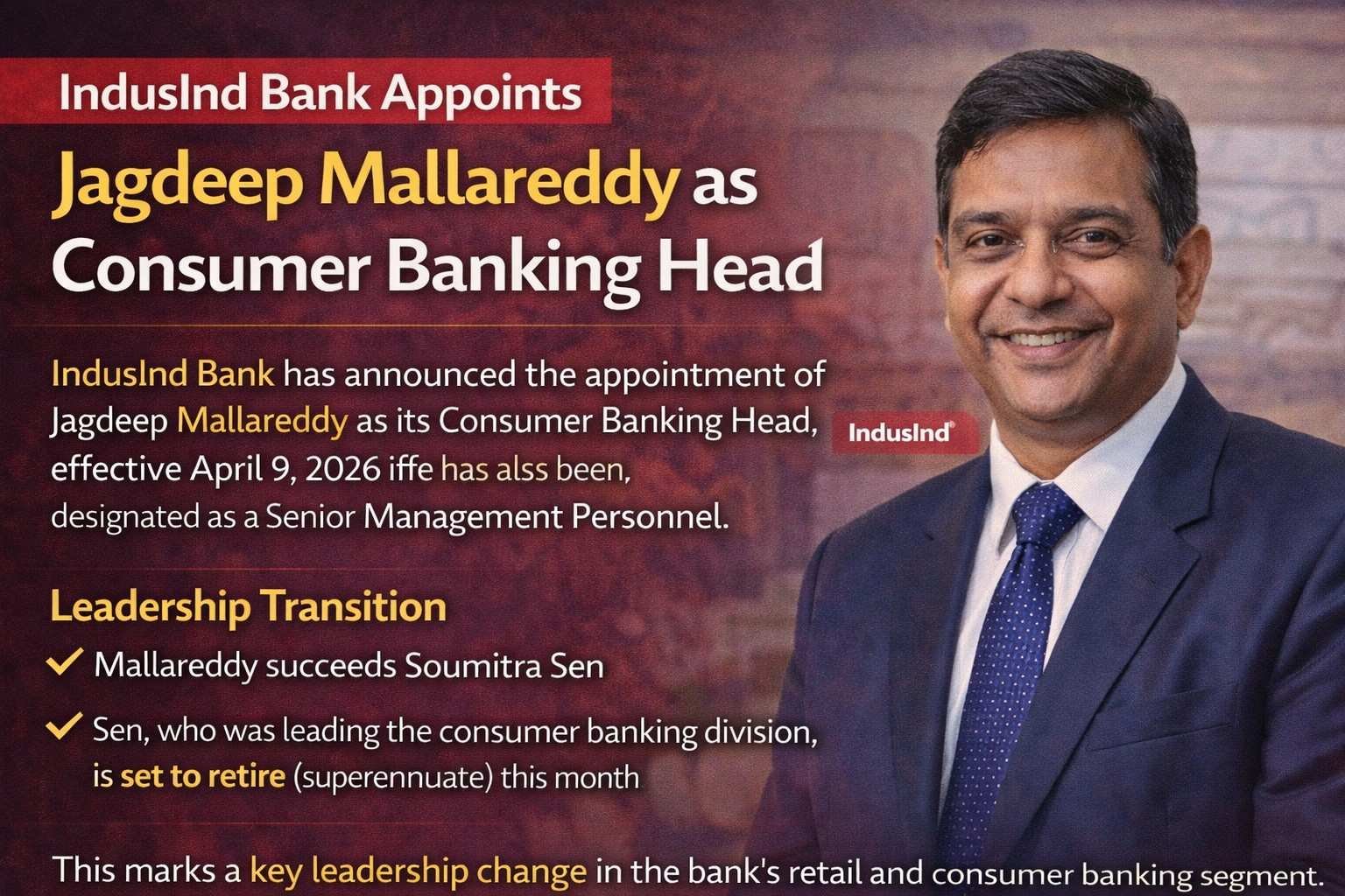 IndusInd Bank has announced the appointment of Jagdeep Mallareddy as its Consumer Banking Head, effective April 9, 2026. He has also been designated as a Senior Management Personnel of the bank.