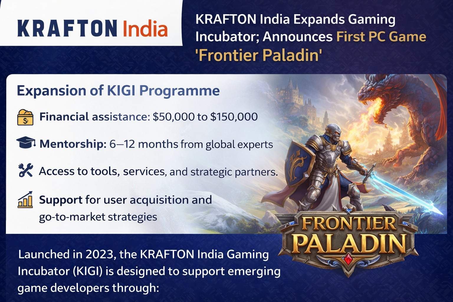 Launched in 2023, the KRAFTON India Gaming Incubator (KIGI) is designed to support emerging game developers through: