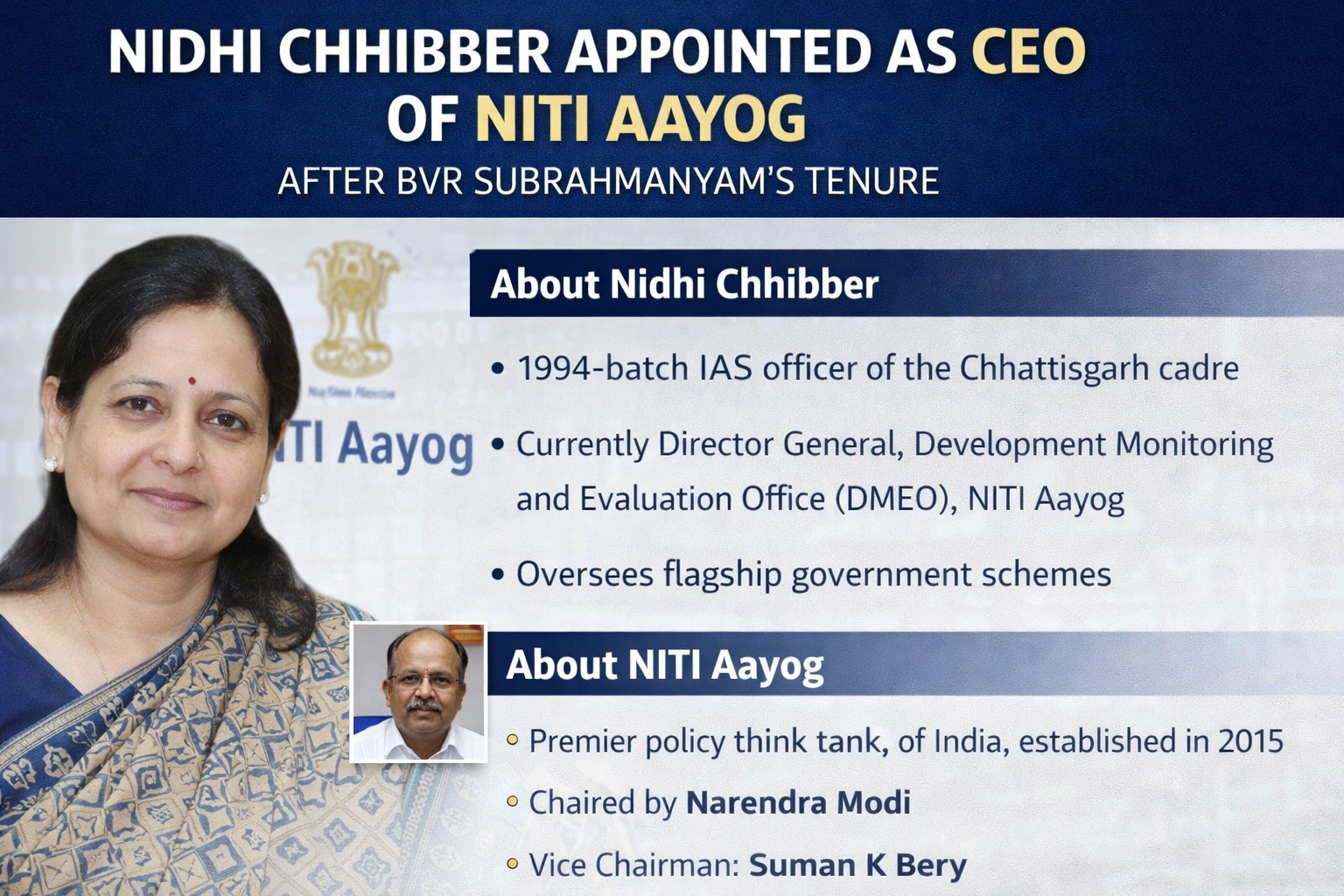 The Central Government has appointed senior IAS officer Nidhi Chhibber as the Chief Executive Officer (CEO) of NITI Aayog following the completion of B V R Subrahmanyam’s extended tenure on February 24, 2026.