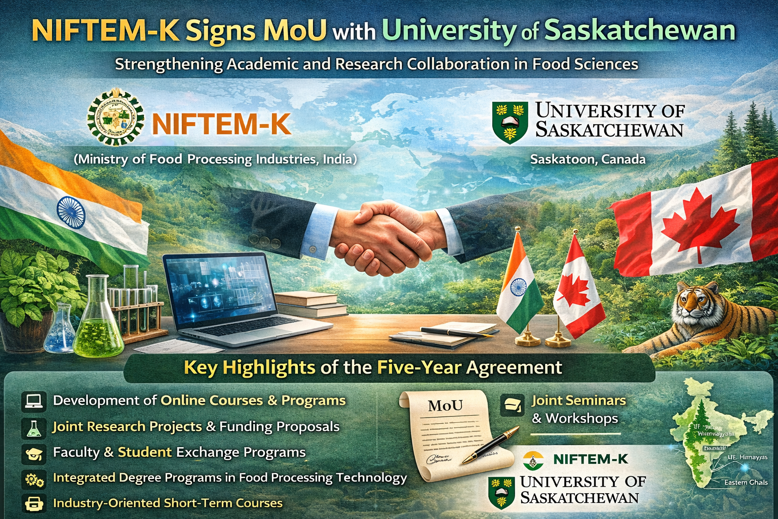 The National Institute of Food Technology Entrepreneurship and Management-Kundli (NIFTEM-K), an Institute of National Importance under the Ministry of Food Processing Industries (MoFPI), has signed a landmark Memorandum of Understanding (MoU) with the University of Saskatchewan (USask), Saskatoon, Canada, to promote academic and research collaboration in food sciences.
