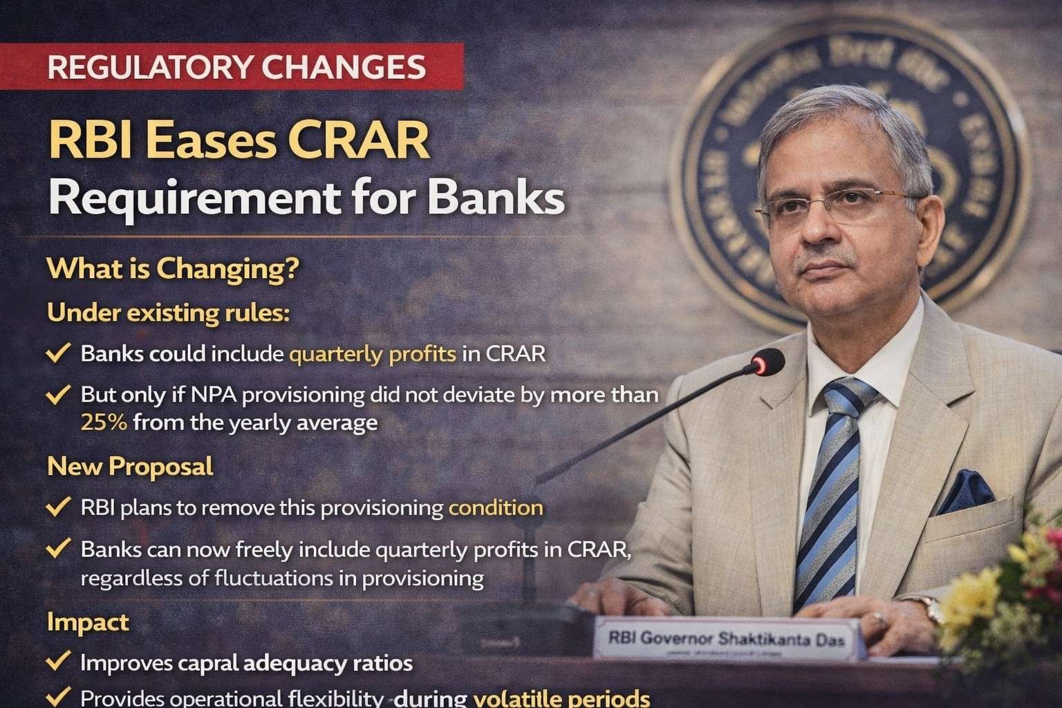 The Reserve Bank of India has proposed key regulatory changes aimed at providing greater flexibility to banks in capital management. The proposals focus on easing norms related to Capital-to-Risk Weighted Assets Ratio (CRAR) and removing certain reserve requirements.