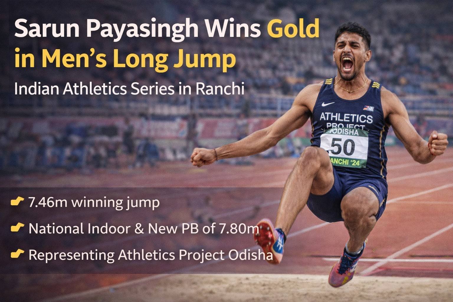 Odisha’s national indoor champion Sarun Payasingh continued his impressive form by winning gold in the men’s long jump at the fourth leg of the Indian Athletics Series held in Ranchi.