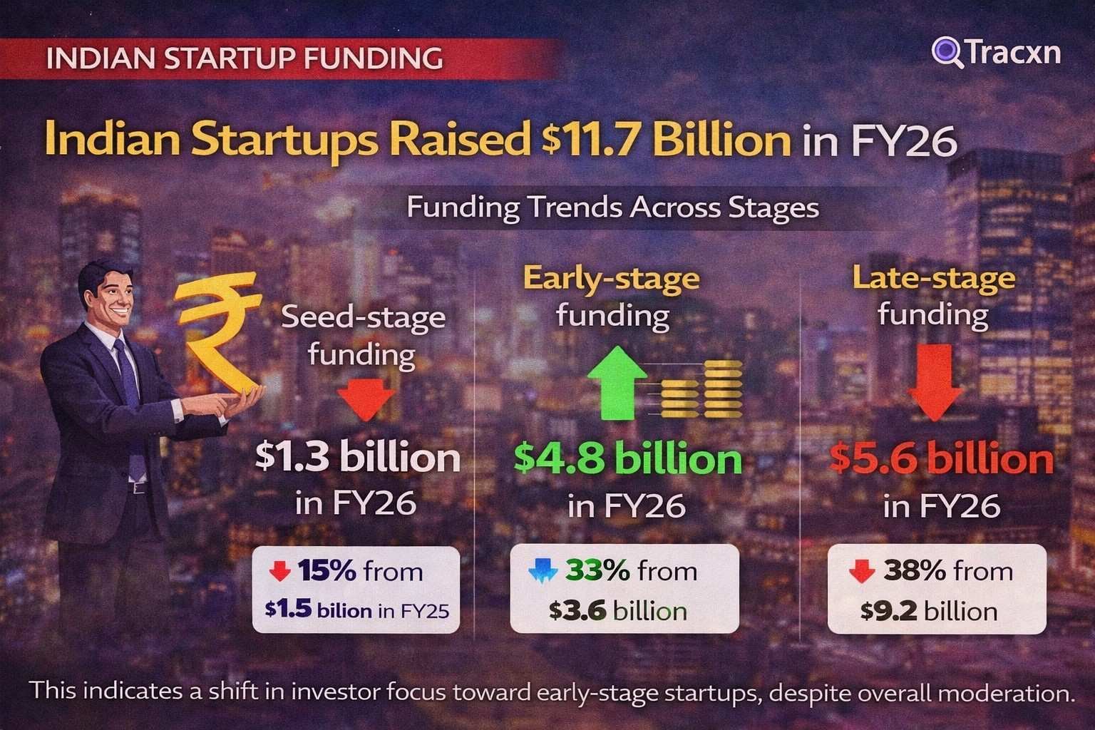 Indian startups raised $11.7 billion in FY 2025–26 (FY26), registering an 18% decline from $14.3 billion in FY25, according to a report by Tracxn.