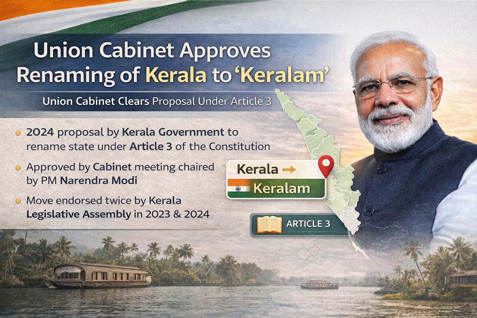 The Union Cabinet has approved a proposal to change the name of the southern state of Kerala to ‘Keralam’. The decision was taken at a Cabinet meeting chaired by Prime Minister Narendra Modi.