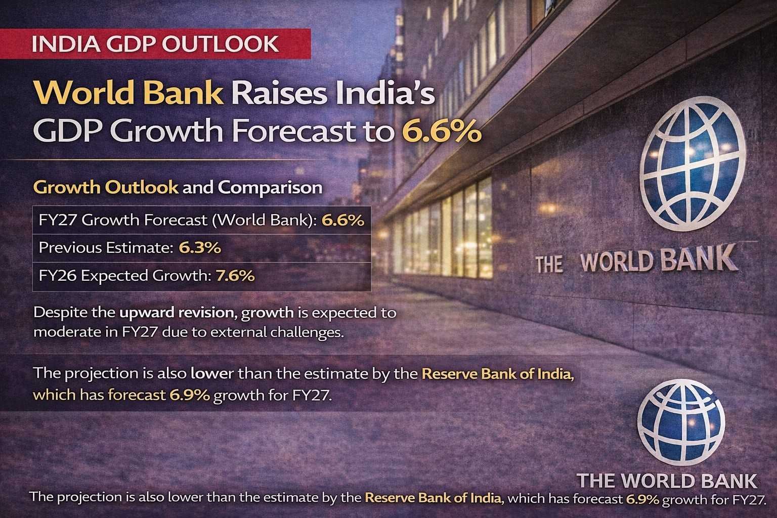 The World Bank has upgraded India’s GDP growth forecast for FY 2026–27 (FY27) to 6.6%, an increase of 30 basis points from its earlier estimate of 6.3% made in October 2025.